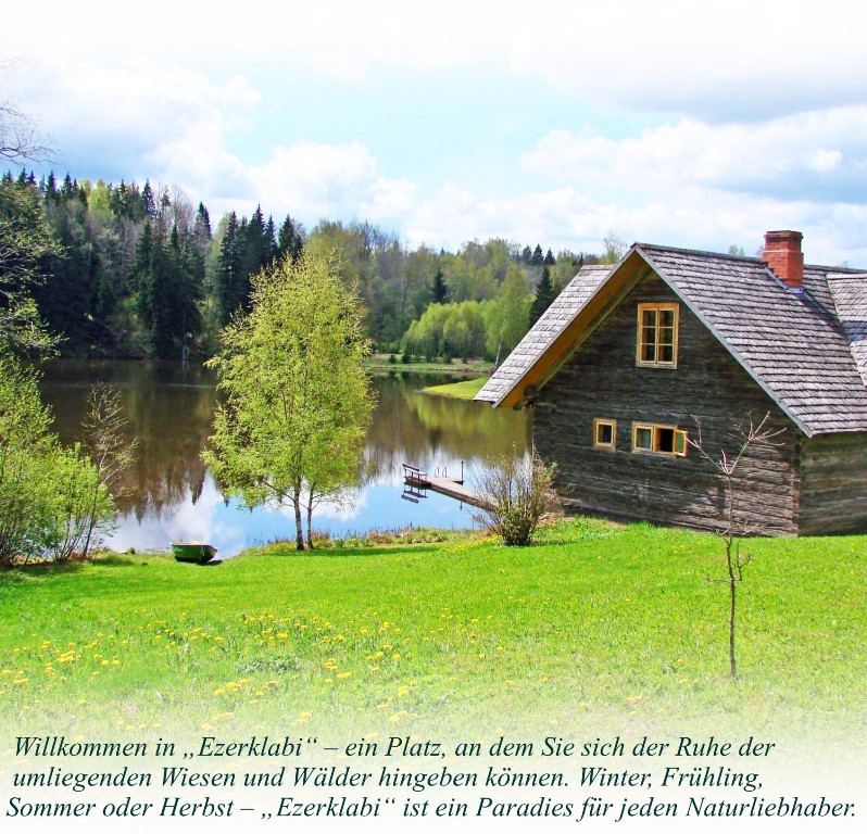 Unsere Gästehäuser „Ezerklabi“ und „Meza Namins“ sind circa 80km vom Flughafen Riga und 18km von der mittelalterlichen Stadt Cesis entfernt. Beide Häuser befinden sich inmitten einer malerischen Landschaft, zwischen größeren und kleineren Seen. Unsere Gästehäuser sind ideal für ruhige Familienurlaube, und für alle, deren Interessen Vogelbeobachtung, Wandern, Fischfang oder einfach nur Spaziergänge sind. Lassen Sie den Stress hinter sich und entdecken Sie den unberührten Frieden und die Ruhe von Ezerklabi! Tel: +37129266445 E-mail: klabi@inbox.lv |